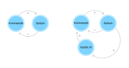 Στα αριστερά, βλέπουμε το σύστημα όπως θα θέλαμε να είναι: η αύξηση της κυκλοφορίας οδηγεί τους υπεύθυνους να αυξήσουν τη χωρητικότητα των δρόμων (γι’ αυτό υπάρχει το σύμβολο + στο επάνω βέλος) και η αύξηση της χωρητικότητας των δρόμων μειώνει την κυκλοφορία (το σύμβολο – στο κάτω βέλος).